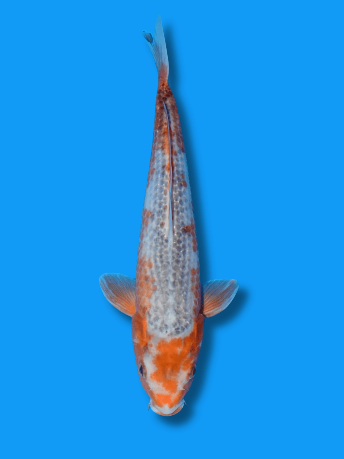 Ein Nisai Asagi aus der Zucht von Marusei mit einer Größe von ca. 35–40 cm. Diese klassische Varietät besticht durch ihr blaues Schuppenmuster entlang des Rückens, kombiniert mit rötlichen Akzenten an Flossen, Bauch und im Kopfbereich. Der Asagi gilt als traditionsreicher Japankoi und überzeugt durch seine ruhige, harmonische Wirkung im Teich.