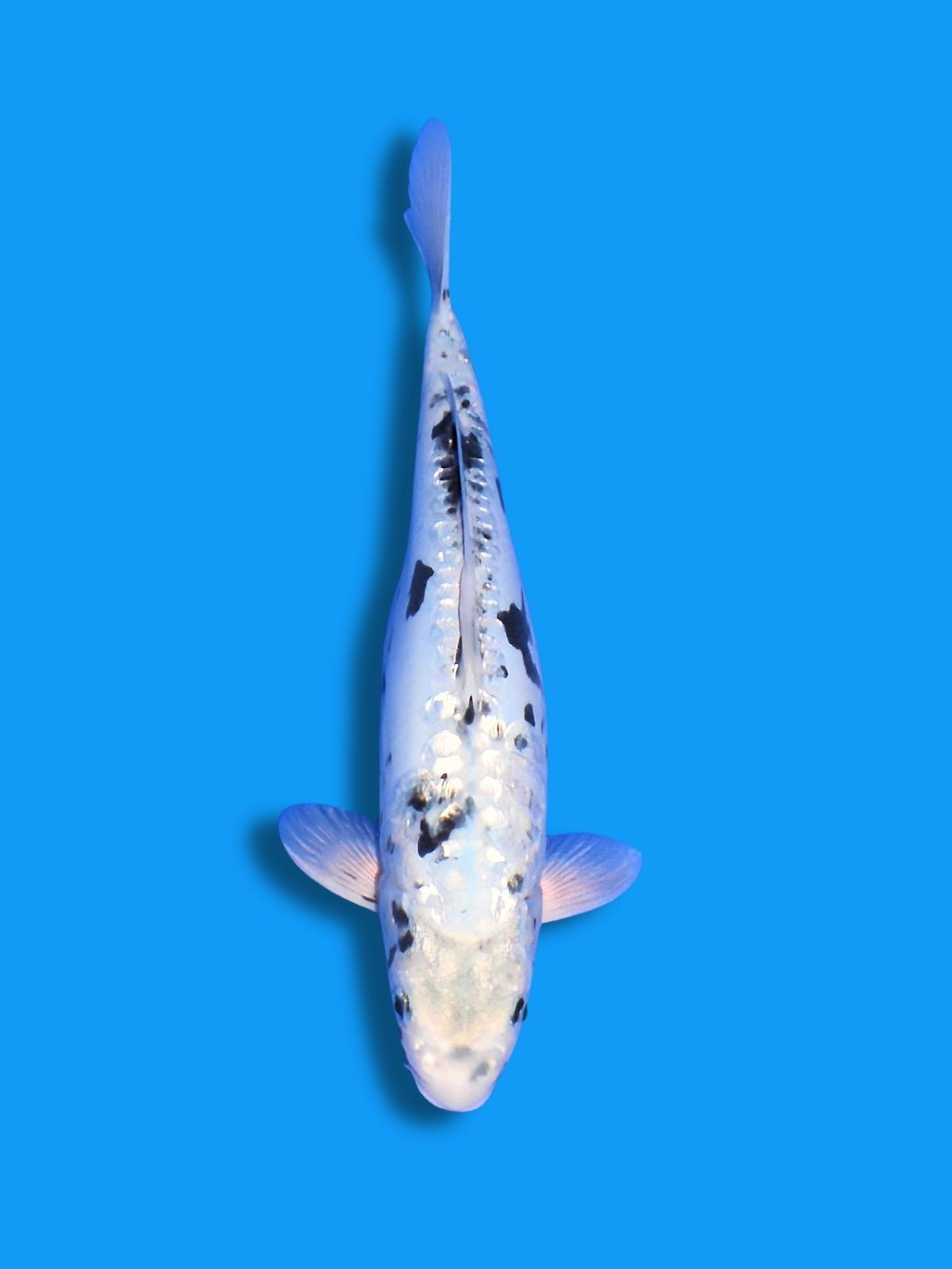 überzeugt durch seine großen Glitzerschuppen auf einem sauberen, metallisch-weißen Körper. Ein wunderschöner Koi mit einem strahlenden Erscheinungsbild.