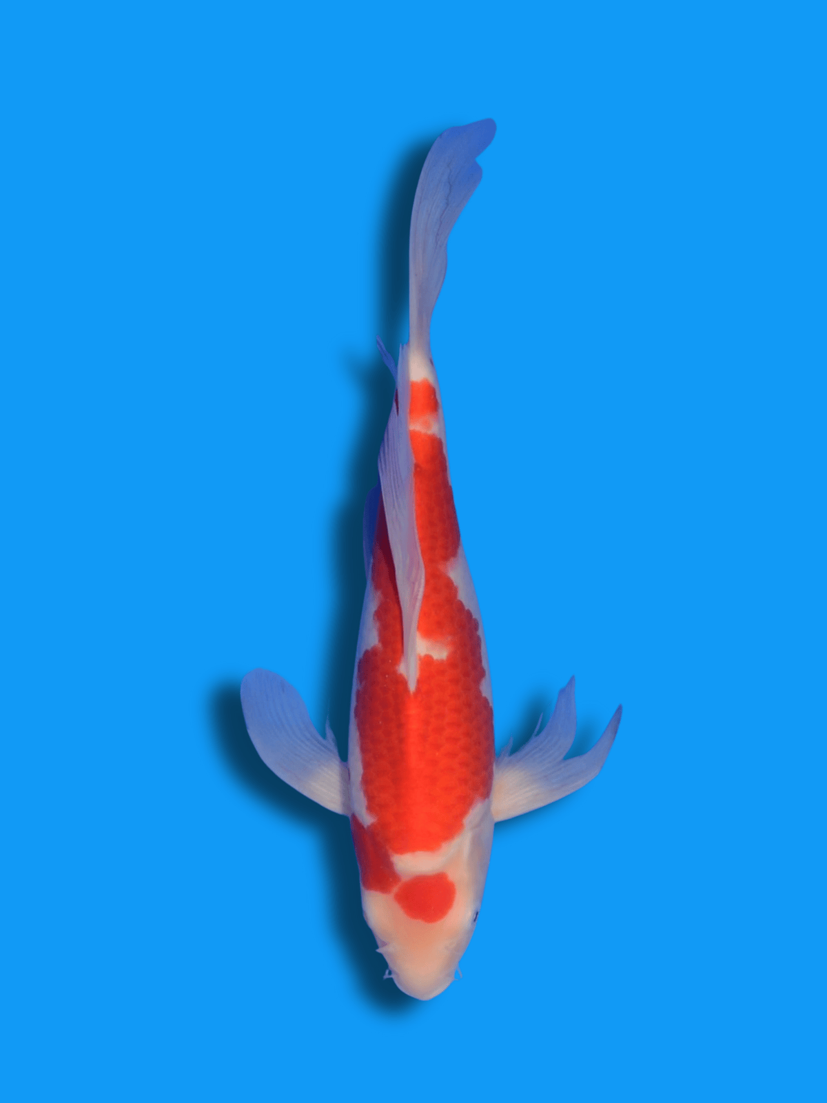 Dieser Butterfly Kohaku zeigt ein besonders tiefes, intensives Rot und eine interessante, auffällige Zeichnung. Die langen Butterfly‑Flossen verleihen ihm eine elegante Ausstrahlung und machen ihn zu einem Blickfang im Teich. Ein schöner Koi für Liebhaber kräftiger Farben.
