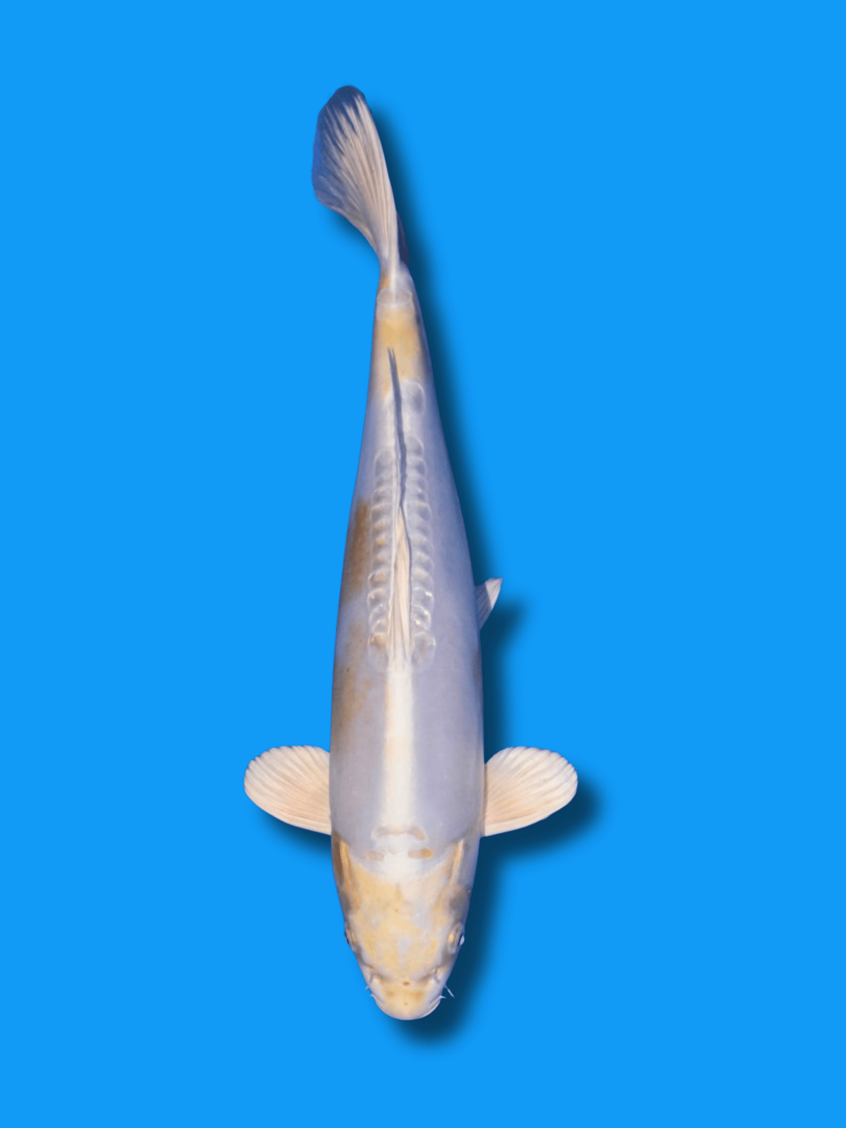 mit schönem, klarem metallischem Glanz. Die helle, glänzende Farbwirkung kommt durch den Doitsu‑Typ besonders gut zur Geltung und macht ihn zu einem auffälligen, strahlenden Koi im Teich.