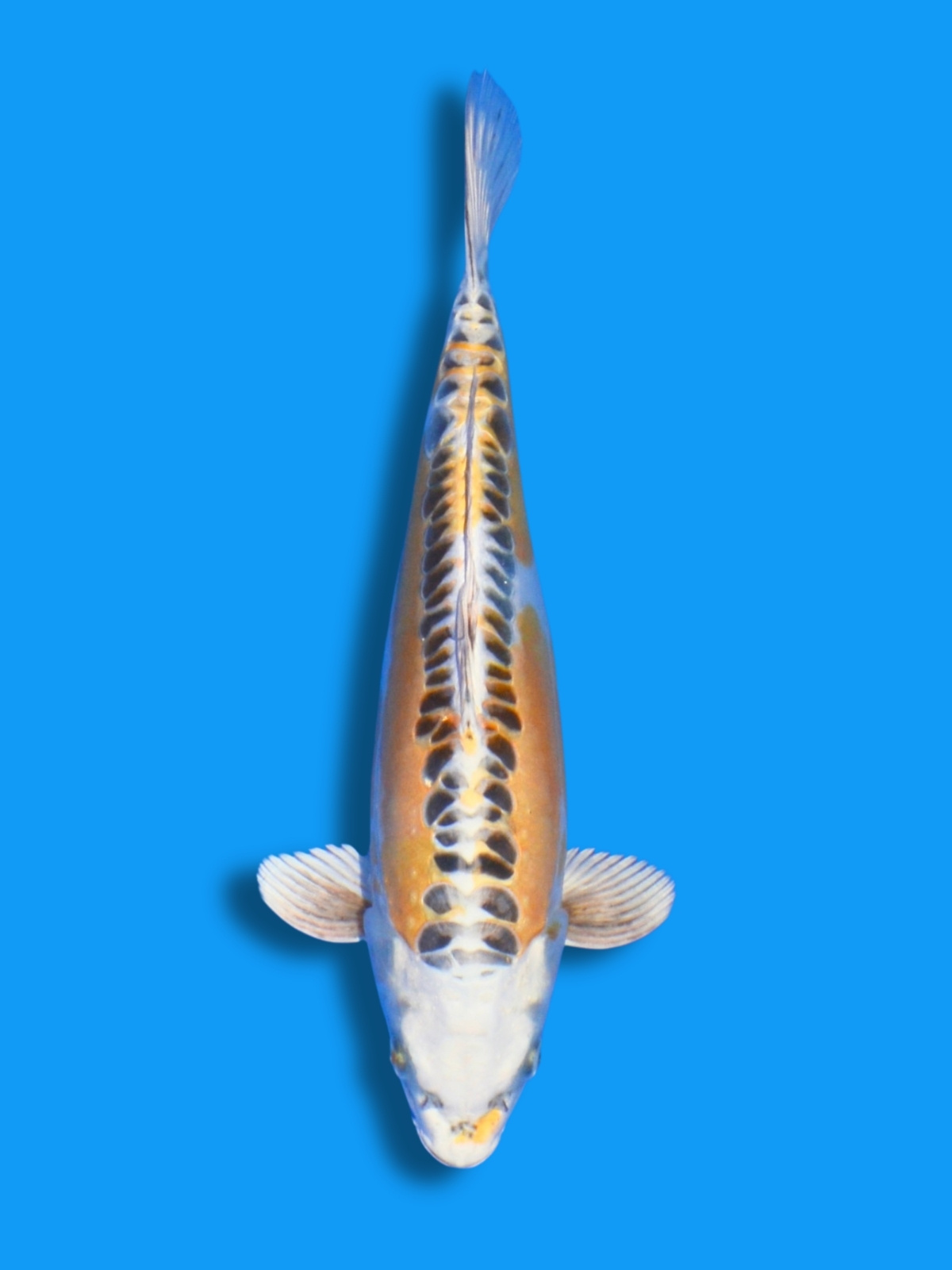 Dieser Doitsu Ki Kujaku ist ein typischer Aoki-Koi mit perfekter Schuppenreihe – einfach klasse! Die Farbe wird noch deutlich intensiver, da der Koi gerade erst in unser Glashaus umgezogen ist und sich weiterhin entwickeln wird.