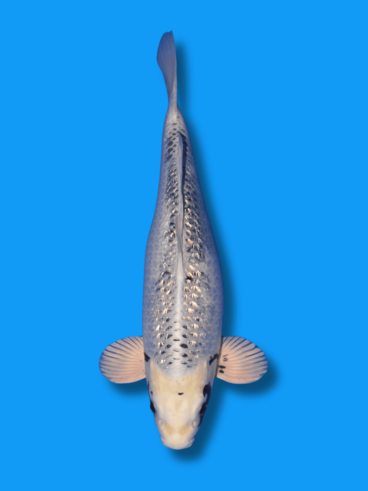 Dieser wunderschöne Ginrin Gin Matsukawabake beeindruckt mit einem massiven Körper, der viel Wachstumspotenzial erahnen lässt. Besonders hervorzuheben sind die glitzernden Perlmuttschuppen, die dem Koi in Kombination mit der Farbgebung eine einzigartige, fast mystische Ausstrahlung verleihen.
