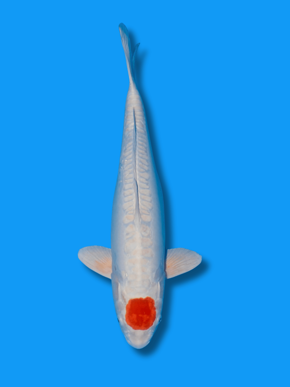 Sehr selten und besonders: Dieses Sansai Tancho Kikusui Weibchen von Oofuchi beeindruckt mit seinem wunderschönen weiß-metallic Schimmer. Durch die metallische Haut zeigt dieser Koi keine typische Stressrötung wie bei herkömmlichen Tancho Kohaku.